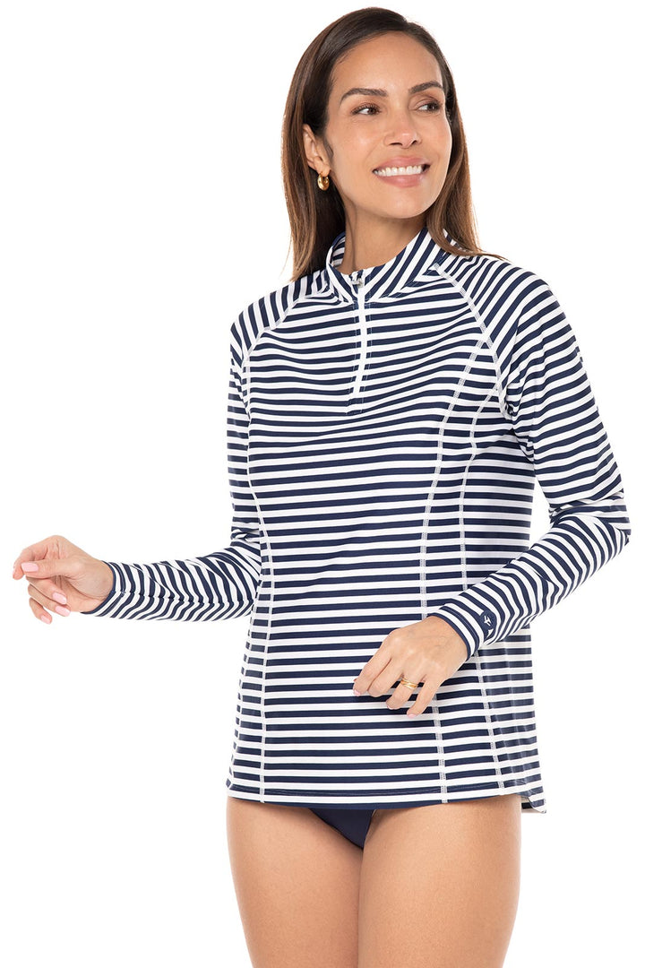 Women's Quarter Zip Rash Guard with Long Sleeves | White/Navy Stripe